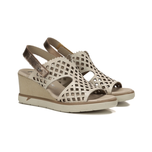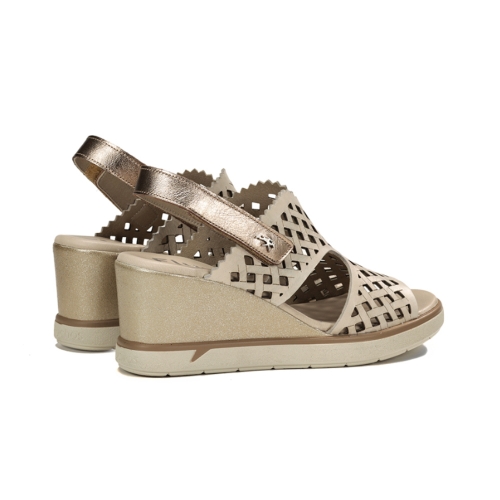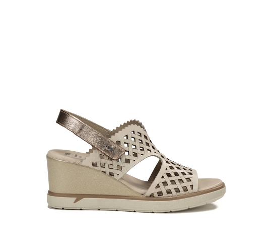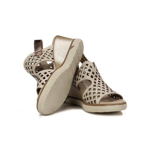 Sofisticación y altura sin renunciar al confort.Eleva tus looks de verano con la sandalia F1972. Este modelo destaca por su corte calado mediante láser con diseño geométrico y su elegante combinación de tonos cava y metalizados. Su cuña de altura media ofrece la estabilidad perfecta, mientras que el cierre de velcro asegura un ajuste rápido y firme. Es la sandalia ideal para eventos o para el día a día de una mujer que busca estilo y bienestar en un solo zapato.