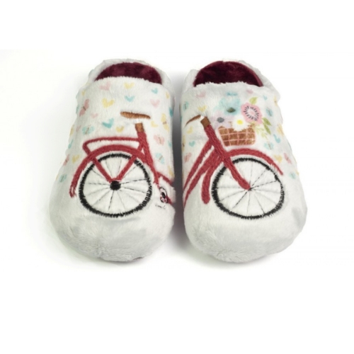 Confeccionadas en un suave tejido aterciopelado (tipo Montlis) en un elegante tono arena (o beige), estas pantuflas destacan por su encantador diseño Bicicleta en la puntera, con detalles en turquesa que aportan un toque de frescura y alegría.