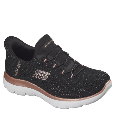 Añade un poco de glamour a tus pasos con las cómodas Skechers Slip-ins®: Summits - Brilliant Shine. Diseñado con nuestro sistema Heel Pillow™, este modelo vegano cuenta con una parte superior de malla decorada con adornos de pedrería, cordones elásticos y una cómoda plantilla con amortiguación Skechers Air-Cooled Memory Foam™.