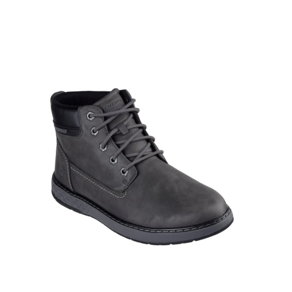 Disfruta de la comodidad de estilo clásico de Skechers Relaxed Fit®: Garlan - Deno. Cuenta con una parte superior de piel vegana waterproof con cordones, una suela Skechers Air-Cooled Memory Foam® con infusión de carbón y amortiguación Goga Mat Arch™ para un mejor apoyo.