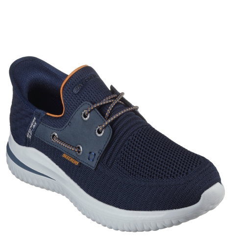 Go Hands Free™ Simply step in and go wearing Skechers Hands Free Slip-ins®: Delson 3.0 - Roth. Designed with our Heel Pillow®, this slip-on boat style features an engineered knit and synthetic upper with stretch laces, a Skechers Air-Cooled Memory Foam® comfort insole, and Goga Mat Arch™ cushioning for added support.