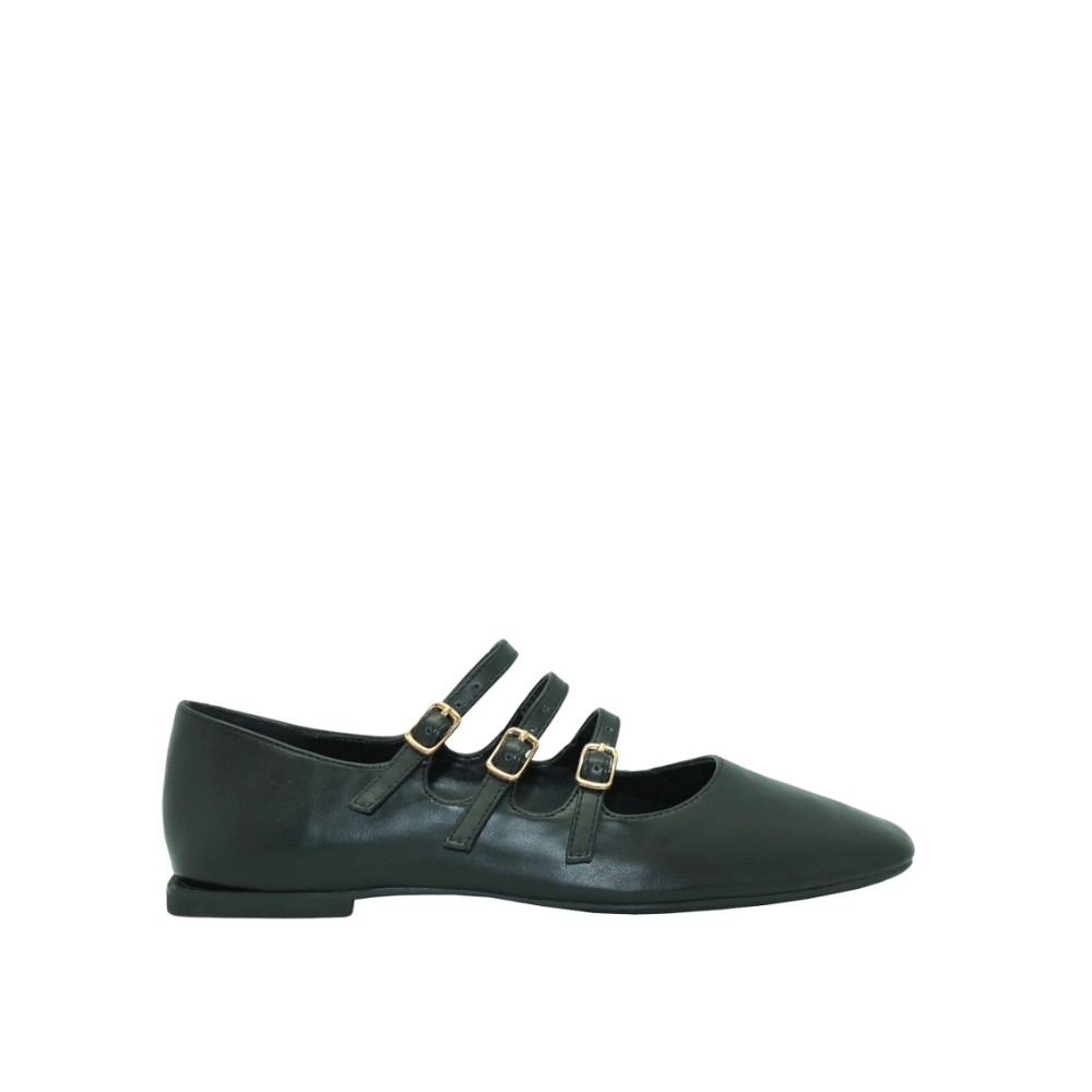 Mercedita para mujer. Fabricado en material sintético, en color negro, plano, suela de goma y con cierre de hebilla